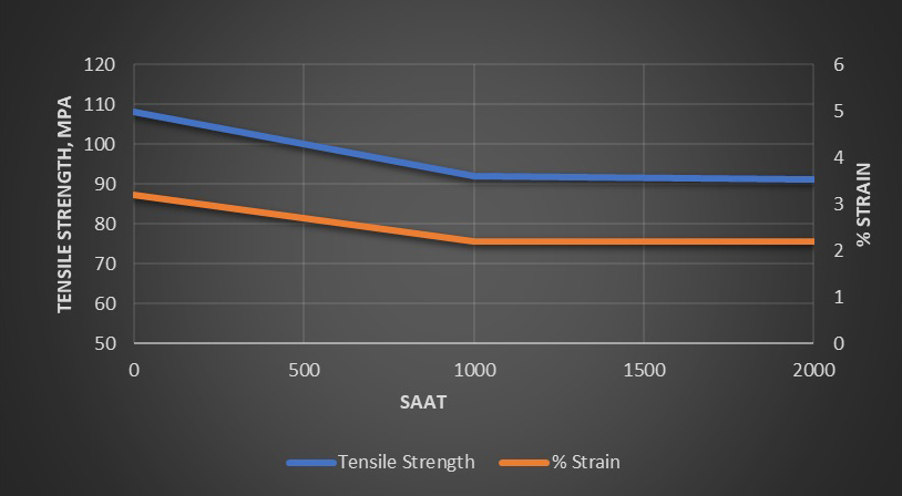 eurotec® has conducted long-term tests to investigate the hydrolysis performance of glass fiber reinforced PP products for critical components in cooling systems such as connectors. Tecolen® HP10 GR35 NL HT A (PPHP, 35% glass fiber reinforced, hydrolysis stabilized, natural) maintained its tensile strength and % elongation values at the end of the test performed in an ethylene-glycol/water (50:50) mixture for 2000 hours at 120°C (Chart 1).