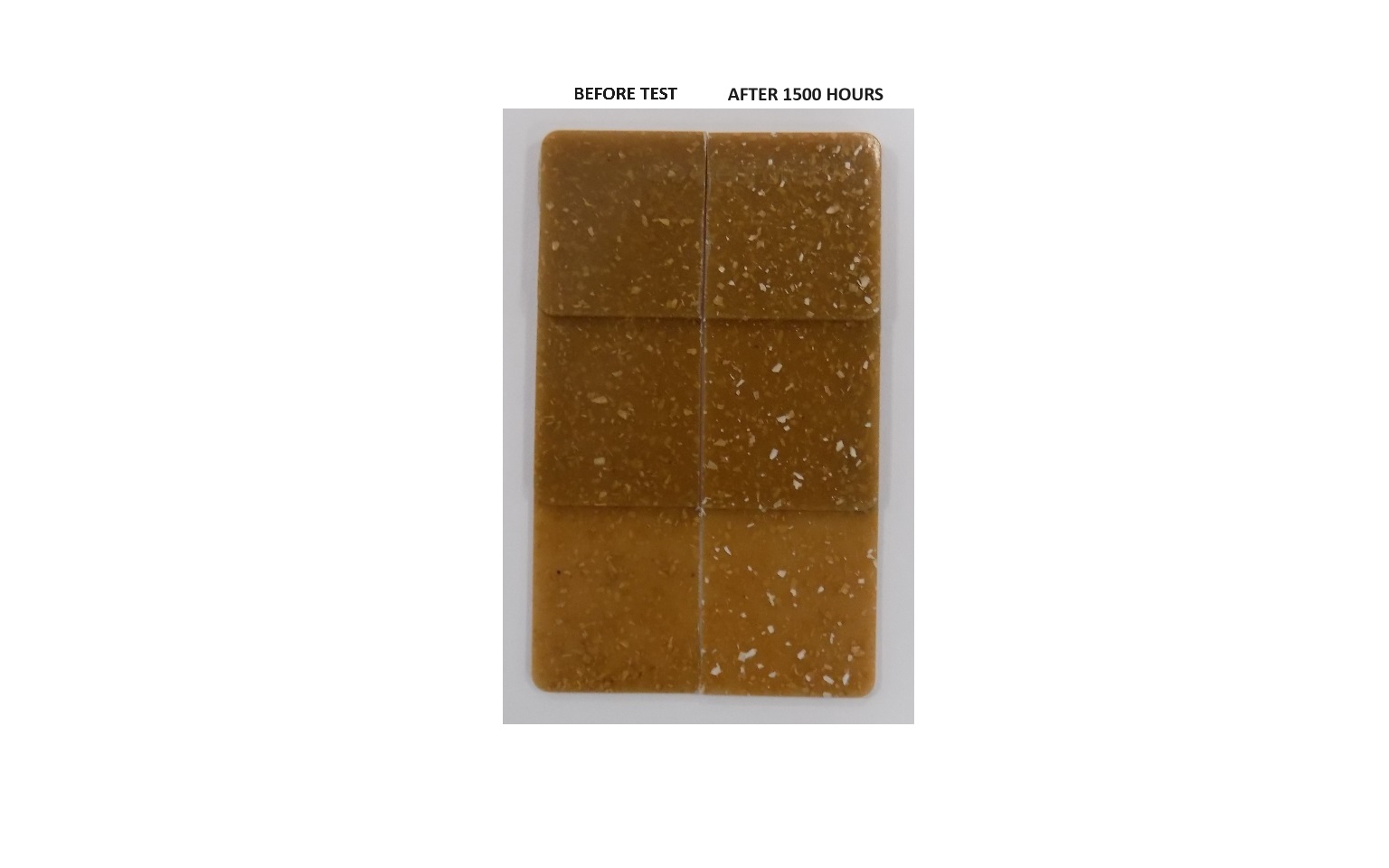 The product Tecolen® BIO HP50 ZF20 BR043 CU 03 0H with a content of 20% glass fiber/natural filler was tested according to ISO 4892-2 test method for 1500 hours and benchmarked by the initial surface properties (Figure 1). Color and surface appearance properties were checked with the test performed by simulating outdoor conditions. The product is perfectly suited to the use in harsh outdoor conditions with its optimized filler/reinforcement ratio and its formulation delivering the right stabilization.